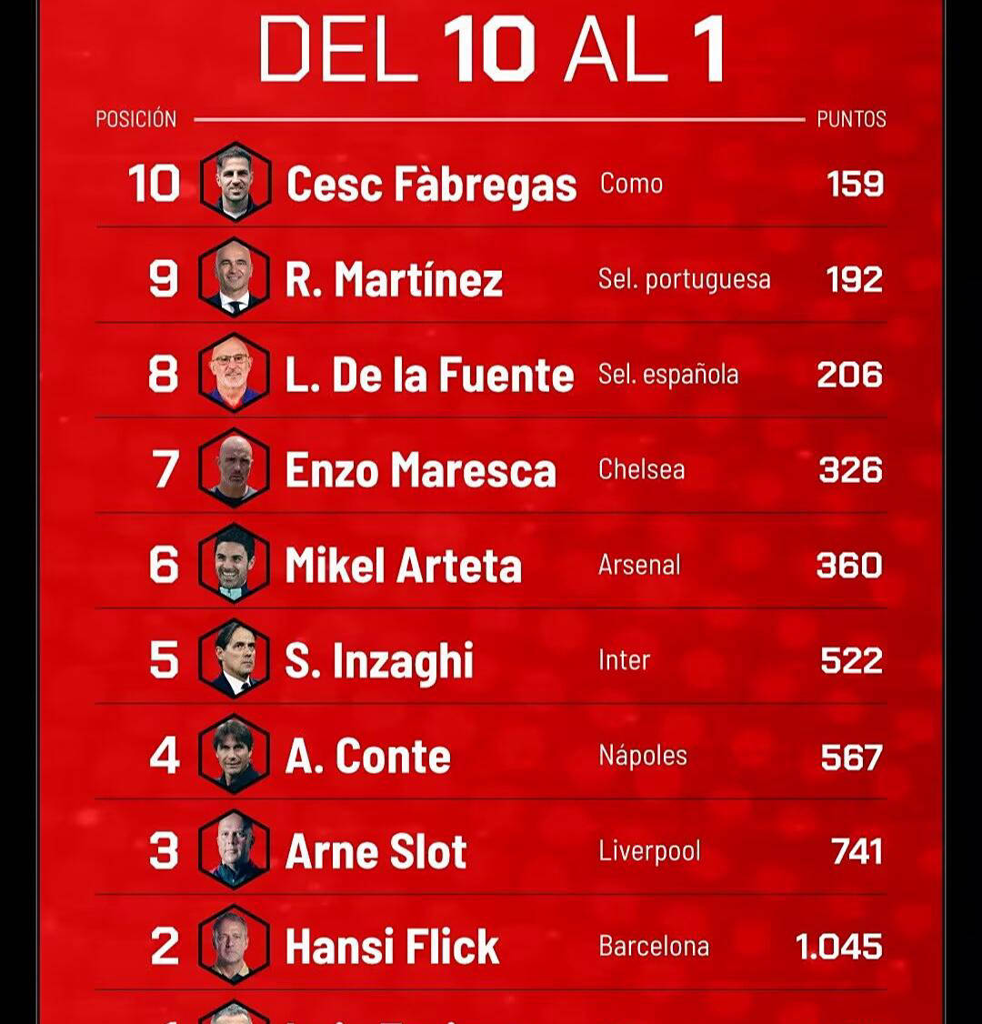 德拉富恩特骤然崛起,带领西班牙队在他的治理下展现出了极强的统治力,因此获得206分,排名第八。而葡萄牙主帅马丁内斯也以192分名列第九,他经过阵容重整,为空有豪华阵容的葡萄牙队带来了突破性的成果,成功赢得欧国联,期待明年美加墨世界杯上获得更佳表现。最后位列第十的是科莫主帅法布雷加斯,作为意甲升班马,他展现了不俗的执教能力。对此份榜单,大家有什么看法呢?